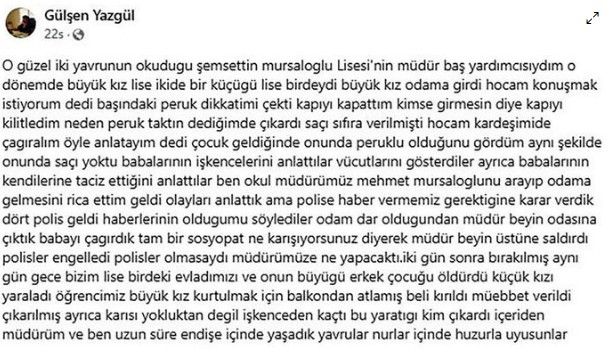 “Biz kendisini tanımadık. İsim, soy isim çıkınca kendisi olduğunu kestirim ettik. Aslında bütün etrafımıza onun öldüğünü söylüyorduk. Evlatlarına bunu yapan insanın diğerlerine karşı daha acımalı davranacağını düşünmüyoruz. Diğerlerine da ziyan vermediğine seviniyoruz. Biz oturduğumuz yeri, hangi kentte yaşadığımızı belirtmiyoruz. Can güvenliğimiz yok.”