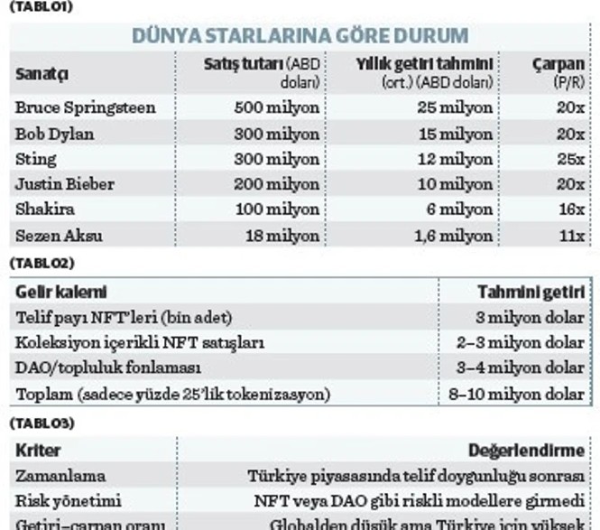Tablo 2’de görüldüğü üzere yani Sezen Aksu, sırf kataloğunun çeyreğini NFT ile tokenize etseydi bile, 8 ile 10 milyon dolarlık gelir potansiyeli yakalayabilirdi. Üstelik yapıtlarının çoğundaki denetimi hâlâ elinde tutarak.