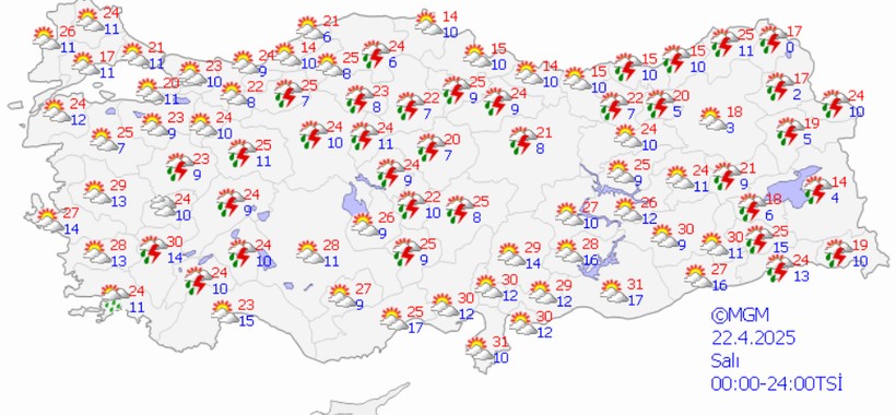 Parçalı ve çok bulutlu, kuzey ve batı kısımlarının lokal sağanak ve gök gürültülü sağanak yağışlı