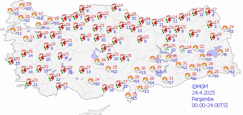 Parçalı ve çok bulutlu, iç kesitleri öğlen saatlerinden sonra sağanak ve gök gürültülü sağanak yağışlı