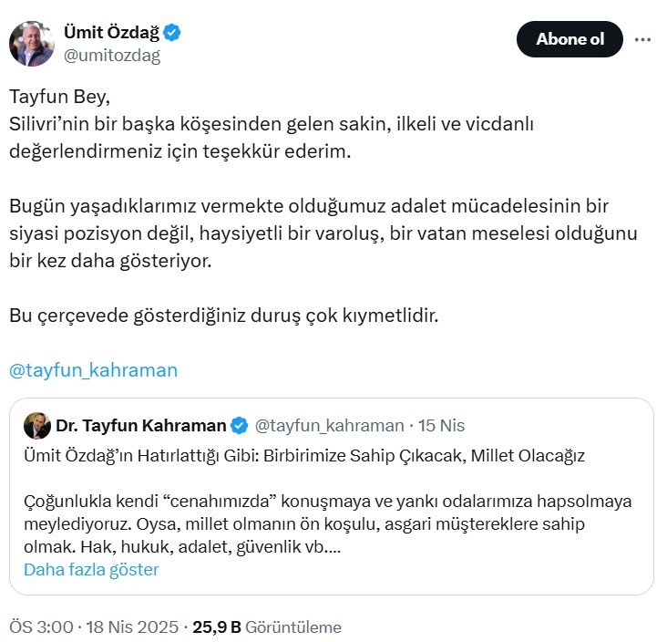 Ümit Özdağ, Kahraman’ın paylaşımını alıntılayarak, “Tayfun Bey, Silivri’nin bir öbür köşesinden gelen sakin, unsurlu ve vicdanlı değerlendirmeniz için teşekkür ederim. Bugün yaşadıklarımız vermekte olduğumuz adalet gayretinin bir siyasi konum değil, haysiyetli bir varoluş, bir vatan sıkıntısı olduğunu bir kere daha gösteriyor. Bu çerçevede gösterdiğiniz duruş çok kıymetlidir” diye yazdı.