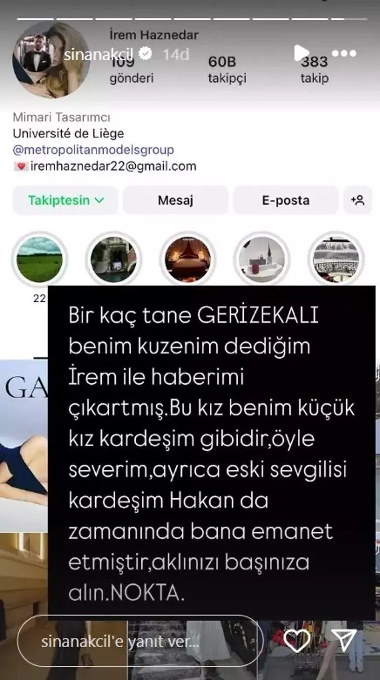 Sosyal medya hesabından İrem Haznedar’ın profilini paylaşan Akçıl, “Birkaç tane gerizakalı benim kuzenim dediğim İrem ile haberimi çıkartmış. Bu kız benim küçük kardeşim üzeredir, o denli severim. Ayrıyeten eski sevgilisi Hakan da vaktinde bana emanet etmiştir aklınızı başınıza alın nokta.” notunu ekledi.