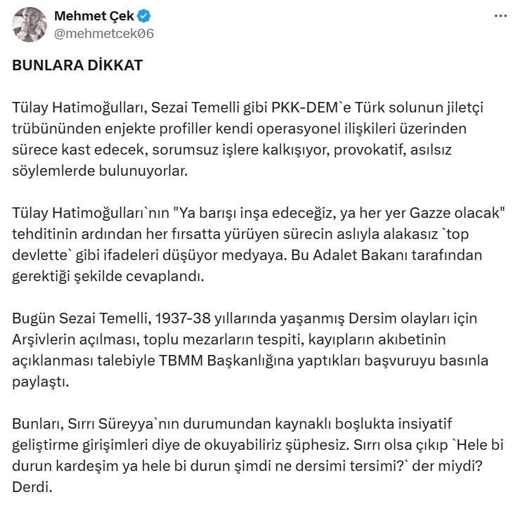 “Tülay Hatimoğulları, Sezai Temelli üzere PKK-DEM`e Türk solunun jiletçi trübününden enjekte profiller kendi operasyonel alakaları üzerinden sürece kastedecek, sorumsuz işlere kalkışıyor, provokatif, temelsiz telaffuzlarda bulunuyorlar” diyen Çek’in paylaşımı şöyle:
