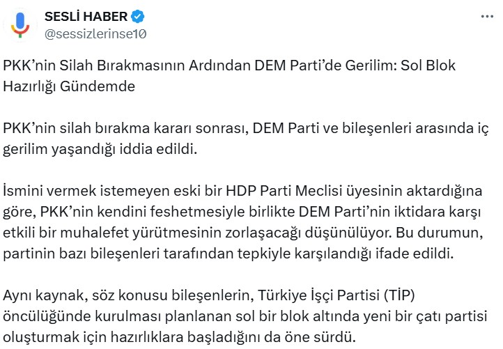 X’te yayın yapan Sesli Haber’in, ismini vermek istemeyen eski bir HDP Parti Meclisi üyesinden aktardığına nazaran, terör örgütü PKK’nin kendini feshedecek olmasıyla birlikte DEM Parti’nin iktidara karşı tesirli bir muhalefet yürütmesinin zorlaşacağı düşünülüyor. Bu durumun, partinin birtakım bileşenleri tarafından reaksiyonla karşılandığı söz edildi.