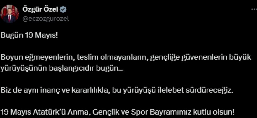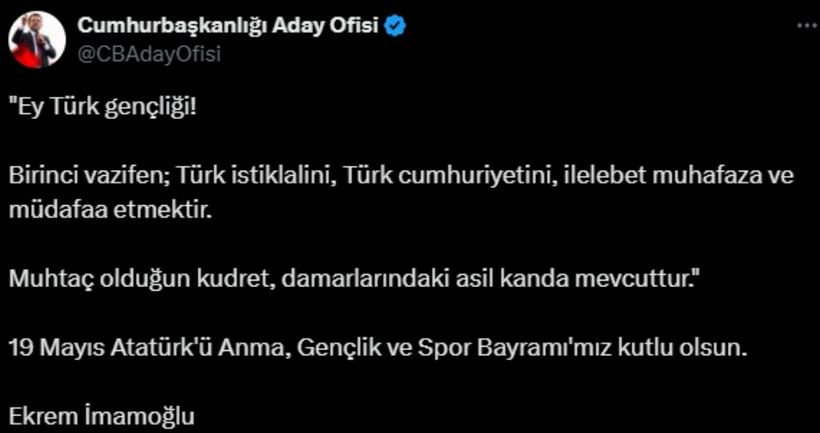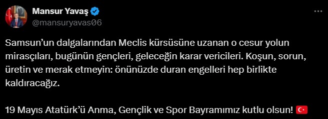 “Samsun’un dalgalarından Meclis kürsüsüne uzanan o cesaretli yolun mirasçıları, bugünün gençleri, geleceğin karar vericileri. Koşun, sorun, üretin ve merak etmeyin: önünüzde duran mahzurları daima birlikte kaldıracağız. 19 Mayıs Atatürk’ü Anma, Gençlik ve Spor Bayramımız kutlu olsun!”