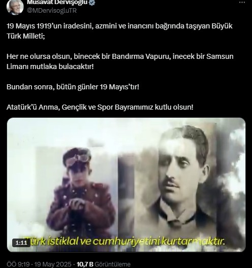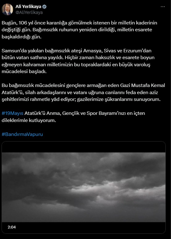 “19 Mayıs 1919’un iradesini, azmini ve inancını bağrında taşıyan Büyük Türk Milleti; Her ne olursa olsun, binecek bir Bandırma Vapuru, inecek bir Samsun Limanı kesinlikle bulacaktır! Bundan sonra, bütün günler 19 Mayıs’tır! Atatürk’ü Anma, Gençlik ve Spor Bayramımız kutlu olsun!”