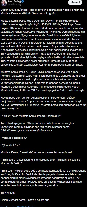 “Bugün 19 Mayıs. İstiklal Harbimizi fiilen başlatmak için ebedi başkanımız Mustafa Kemal Atatürk’ün Samsun’a çıktığı gün. Mustafa Kemal Paşa, 1917’de Osmanlı Devleti’nin de içinde olduğu ittifakın yenileceğini öngörmüştür. 20 Eylül 1917’de, Talat Paşa, Enver Paşa ve İttihat ve Terakki Cemiyeti Merkezi genel üyelerine bir mektup yazarak, Almanya, Avusturya-Macaristan ile Osmanlı Devleti’nin de savaşı kaybettiğini; savaş sonunda, Anadolu’nun sefaletini, halkın açlık ve ümitsizliğini, bürokrasinin çürümüşlüğünü söz etmiştir. Galip devletlerin Osmanlı topraklarına ait planlarını gören Mustafa Kemal Paşa, 1917 sonbaharından itibaren, dünya harbinden sonra Anadolu’da başlayacak ikinci bir savaşın fikri hazırlıklarına başlamıştır. Türk süngüsü ile Türk milleti birebir hatta gelince, ordunun direnişinin yanında milletin direnişinin de başlayacağını, hatta ordu direnmese bile Türk milletinin direneceğini öngörmüştür. Nitekim de Kilis halkı savaşmıştır. Antep, Gazi; Maraş, Kahraman; Urfa bu türlü Ulu olmuştur”