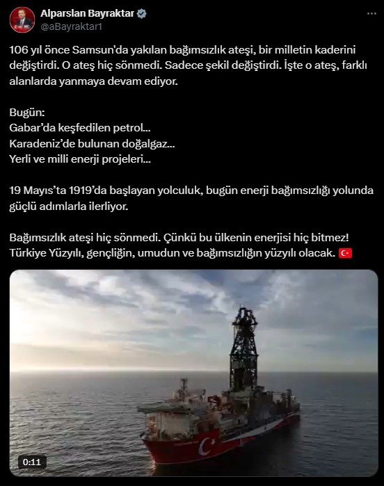 “19 Mayıs’ta 1919’da başlayan seyahat, bugün güç bağımsızlığı yolunda güçlü adımlarla ilerliyor. Bağımsızlık ateşi hiç sönmedi. Zira bu ülkenin gücü hiç bitmez! Türkiye Yüzyılı, gençliğin, umudun ve bağımsızlığın yüzyılı olacak”