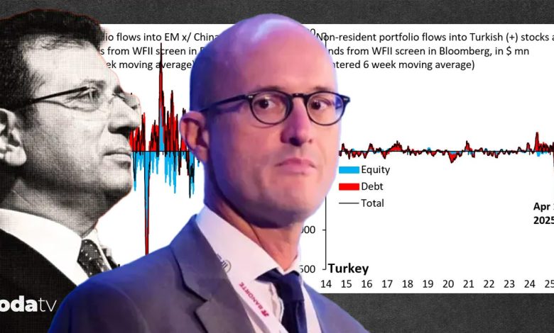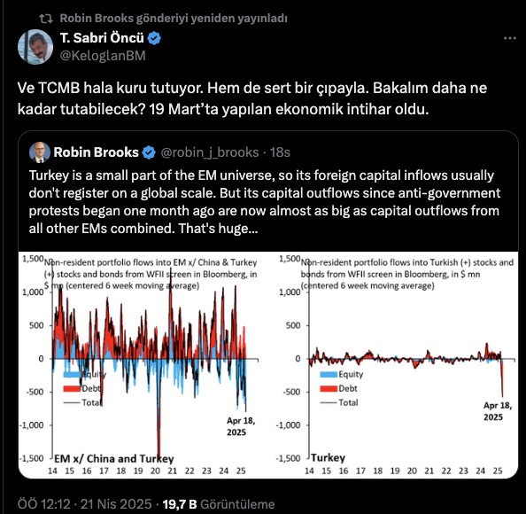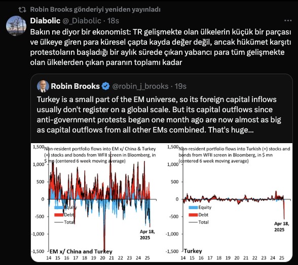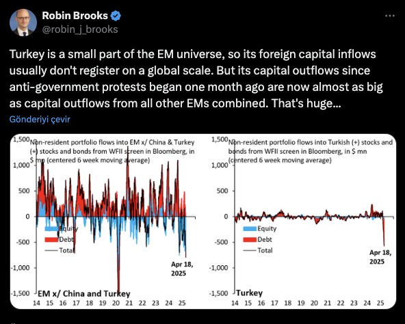Goldman Sachs Dış Ticaret Şefi Robin Brooks, İBB Başkanı Ekrem İmamoğlu’na yönelik yapılan operasyonun 1 aylık sonuçlarını incelediği bir paylaşımda bulundu. Brooks “Türkiye gelişmekte olan ülkelerin küçük bir kesimi ve ülkeye giren para global çapta kayda paha değil, lakin hükümet aksisi protestoların başladığı bir aylık müddette çıkan yabancı para tüm gelişmekte olan ülkelerden çıkan paranın toplamı kadar” tabirlerini kullandı. Paylaştığı tablo ile yabancı yatırımcıların son 1 ayda Türkiye’den süratle çıktığını vurguladı.