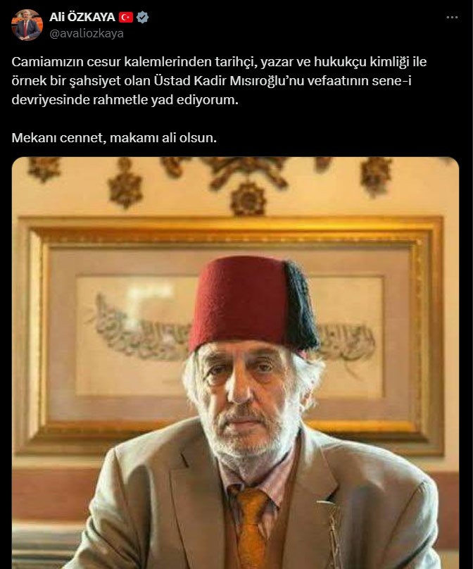 AKP Afyonkarahisar Milletvekili Ali Özkaya, tartışmalı açıklamalarıyla kamuoyunda sık sık gündeme gelen Kadir Mısıroğlu’nun mevt yıl dönümünde toplumsal medya hesabından taziye bildirisi yayınladı.