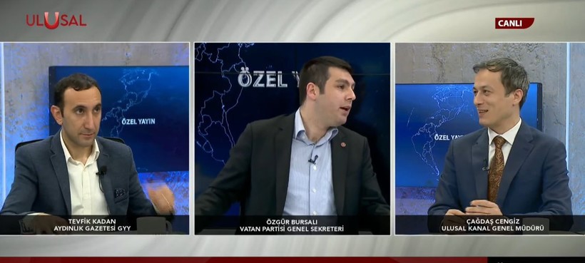 Vatan Partisi Genel Sekreteri Özgür Bursalı: Muhalefetin tutumu maalesef ‘Bu süreç Tayyip Erdoğan’a fayda mı yaramaz mı’, ‘AK Parti’nin oylarını artırır mı artırmaz mı’ sığlığında gelişiyor. Yani orada bir Türkiye yok Türkiye’nin geleceği yok, Türkiye’nin bütünleşmesi yok. Onlar maalesef Atlantik güdümlü senaryoların içerisinde bu sürece müdahalelerde bulunuyorlar.