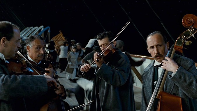 Keman orkestranın “Nearer My God to Thee”yi (Tanrım Sana Daha da Yakınım) çaldığı, gemi batarken yolcuları sakinleştirmeye çalıştıkları sahnede kullanıldı.