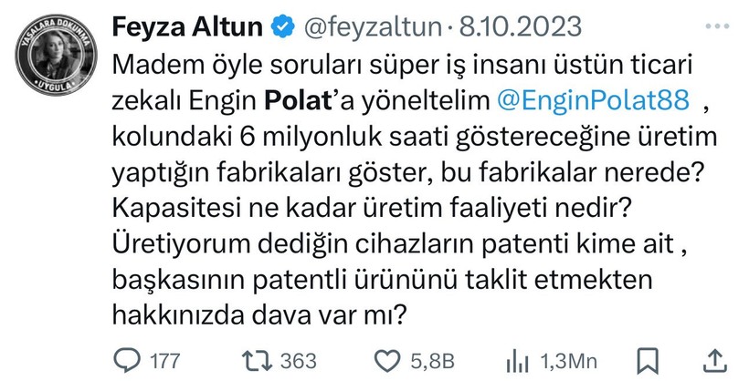 Polat çiftinin “vergi kanununa muhalefet ve geçersiz fatura düzenleme ve kullanma’ kabahatlerinden tutuklu yargılandığı periyotta Feyza Altun’un ikili ağır tenkitleri ve yorumları oldu. Altun, Engin Polat için, “Kolundaki saati göstereceğine üretim yaptığın fabrikalarını göster” sözlerini kullandı.