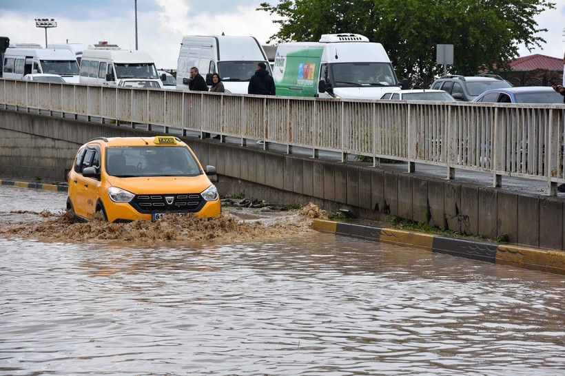 Şiddetli yağış hasebiyle birtakım araçlar yolda mahsur kaldı, birçok noktada konut ve iş yerlerini su bastı.
