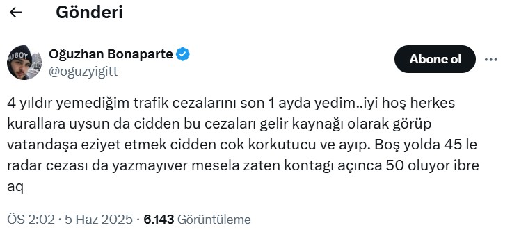 Sosyal medya ünlüsü Oğuzhan Bonaparte, “4 yıldır yemediğim trafik cezalarını son 1 ayda yedim. Düzgün güzel herkes kurallara uysun da gerçekten bu cezaları gelir kaynağı olarak görüp vatandaşa eziyet etmek gerçekten çok korkutucu ve ayıp. Boş yolda 45’le radar cezası da yazmayıver mesela. Zati kontağı açınca 50 oluyor ibre” halinde paylaşım yaptı.