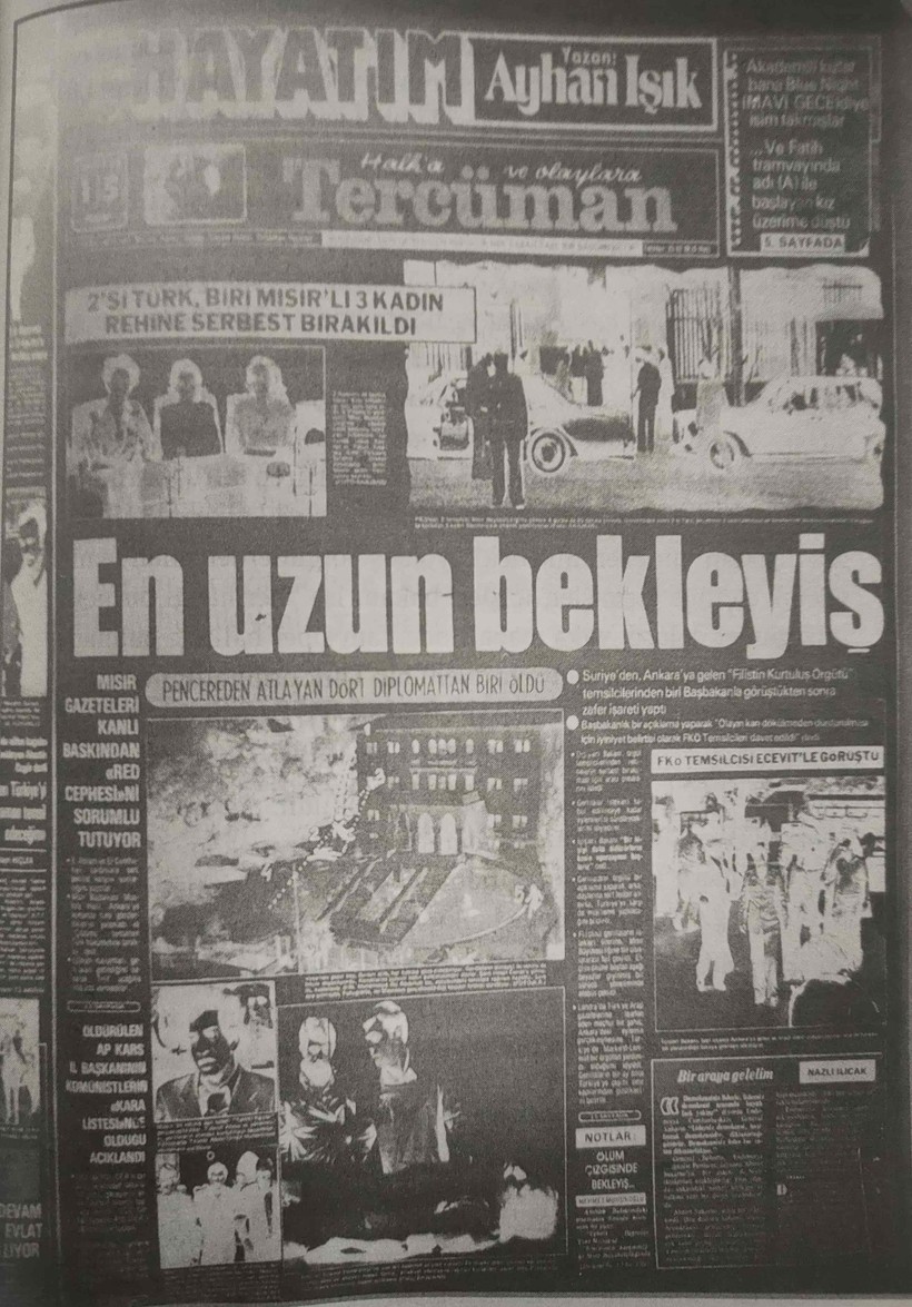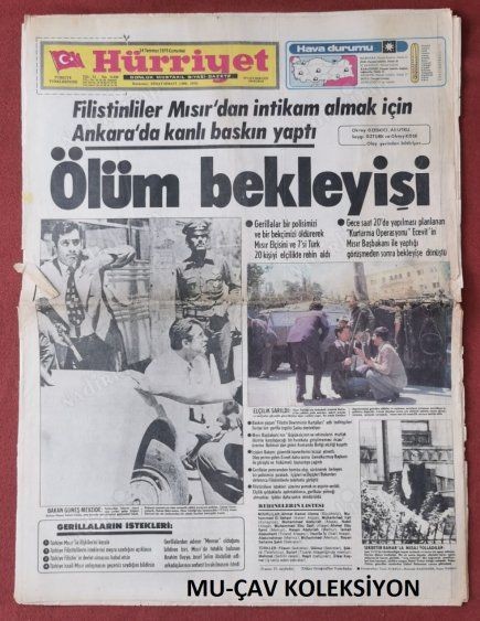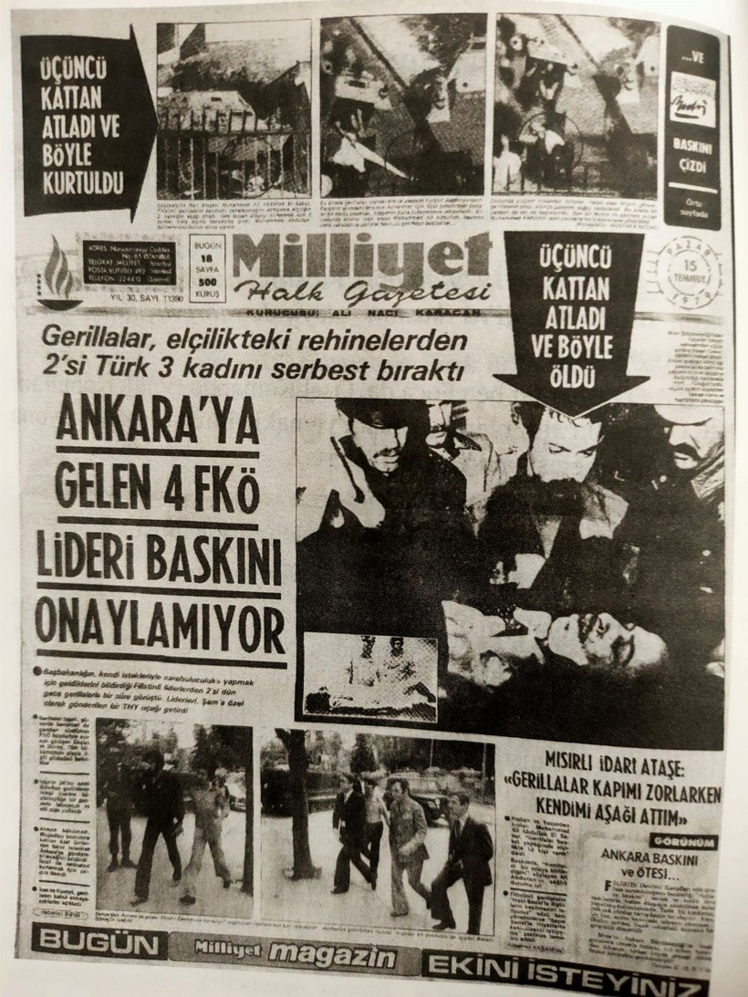 Ankara’da Mısır Büyükelçiliğini basan dört Filistinli, elçilik çalışanını rehin aldı. Çıkan çatışmada, bir polis ve bir bekçi şehit edildi. Mısır Büyükelçisi Ahmet Kemal Ulema’nın da bulunduğu yedisi Türk 20 elçilik vazifelisi rehin alındı. Aksiyoncular 15 Temmuz’da teslim oldu.