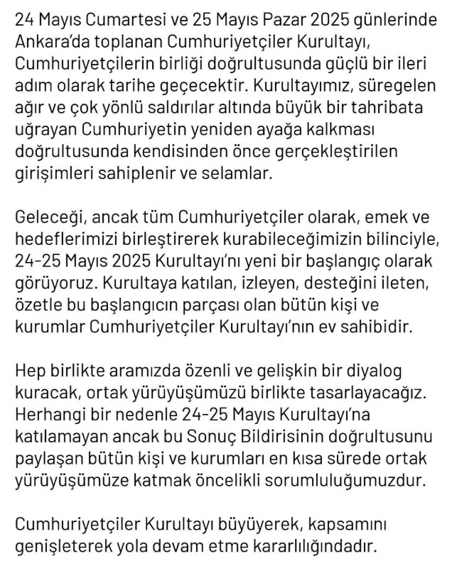 Kurultay, tüm iştirakçileri “Cumhuriyetçi Cephe” altında örgütlenmeye davet etti. Panel, sempozyum ve halk toplantılarıyla örgütlenmenin derinleştirileceği duyuruldu.