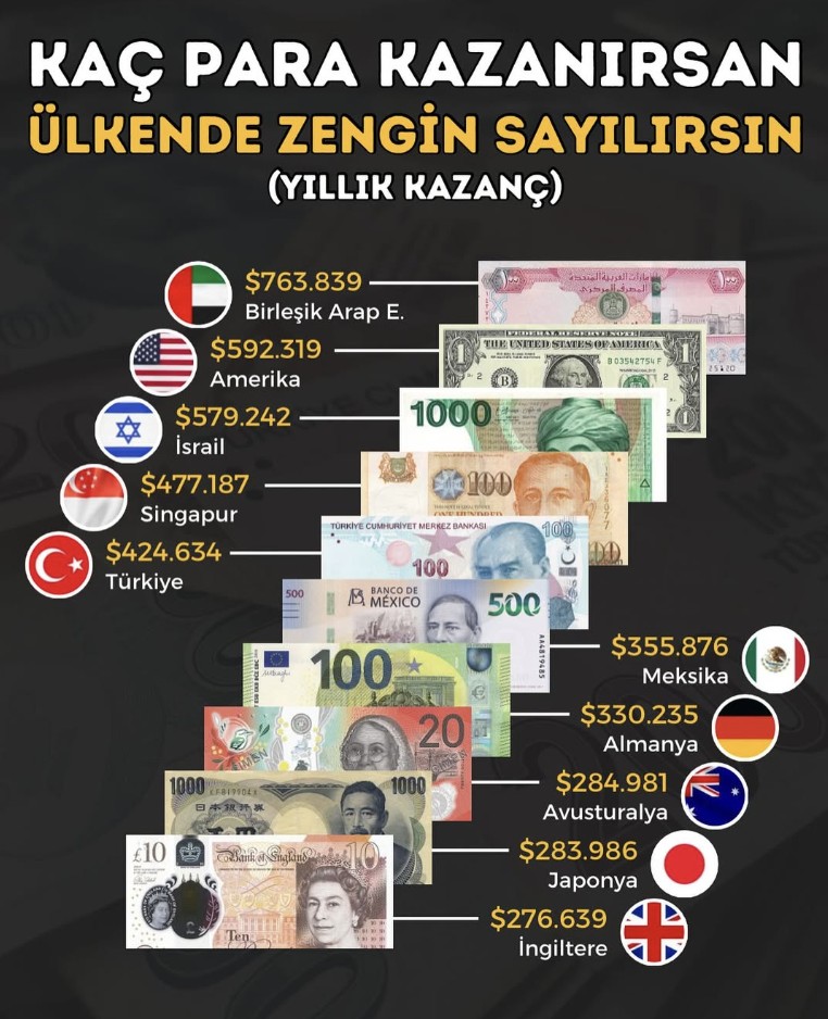 Borsayı Anla Instagram hesabından yayınlanan haberde birtakım ülkelerde güçlü sayılmak için gereken yıllık gelirler: