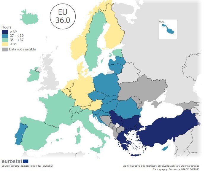 Eurostat dataları Türkiye’yi kapsamıyor. Fakat TÜİK’in “İşgücü İstatistikleri, Mart 2025” isimli raporuna nazaran, Türkiye’de mevsim ve takvim tesirlerinden arındırılmış haftalık ortalama fiili çalışma mühleti 43,7 saat oldu.