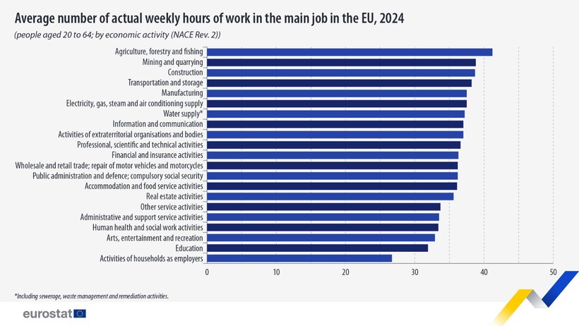 Sektörel bazda bakıldığında tarım, ormancılık ve balıkçılık dallarında çalışanlar haftada ortalama 41,2 saat çalışıyor. Madencilik ve taş ocakçılığı 38,8 saat, inşaat dalı de 38,7 saat ile uzun çalışma müddetleriyle öne çıkıyor. Buna karşılık, mesken hizmetlerinde çalışanlar haftada yalnızca 26,7 saat çalışıyor. Eğitim kesimi ise 31,9 saat ve sanat, cümbüş ve rekreasyon dalı de 32,9 saat ile daha kısa çalışma müddetlerine sahip.