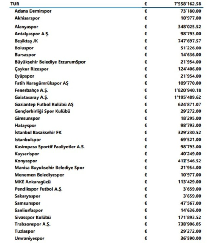 İşte Türk kulüplerinin aldıkları ödemeler: