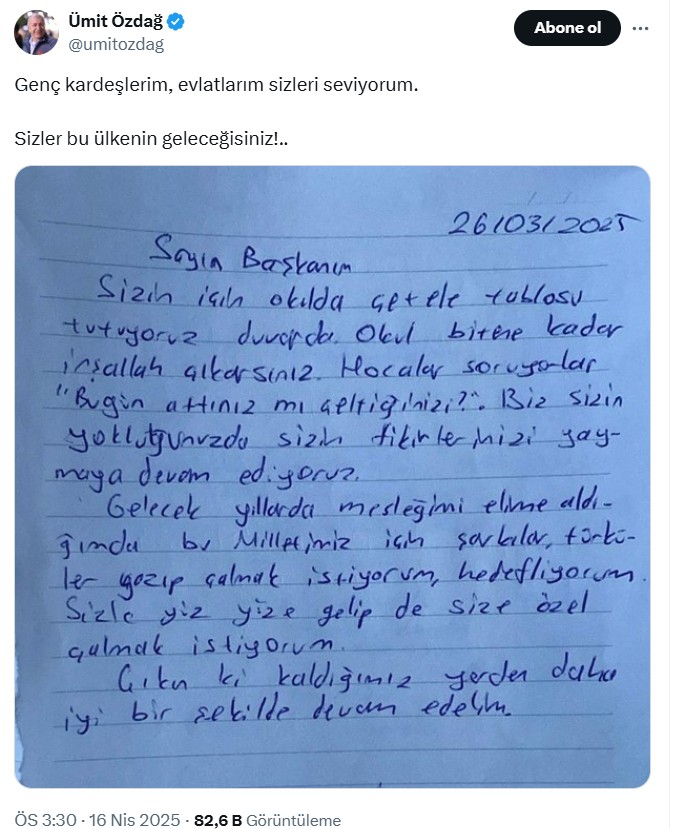 Zafer Partisi Genel Lideri Ümit Özdağ’ın toplumsal medya hesabından yapılan paylaşımda, kendisine gönderilen bir mektup paylaşıldı. “Genç kardeşlerim, evlatlarım sizleri seviyorum. Sizler bu ülkenin geleceğisiniz!..” tabirleriyle paylaşılan o mektupta bir genç şunları söyledi: