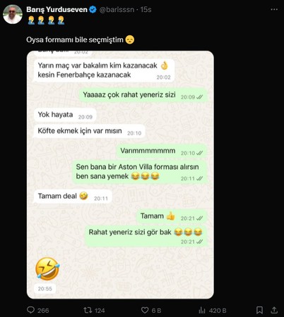 Fenerbahçe’nin Trabzonspor’u yenmesinden sonra iddiayı kaybeden Yurduseven, X hesabından Yaz Yıldırım ile konuşmasını paylaşarak “Oysa formamı bile seçmiştim.” tabirini kullandı.