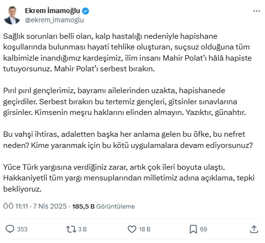Ekrem İmamoğlu, toplumsal medya hesabından yaptığı açıklamada şunları söyledi: