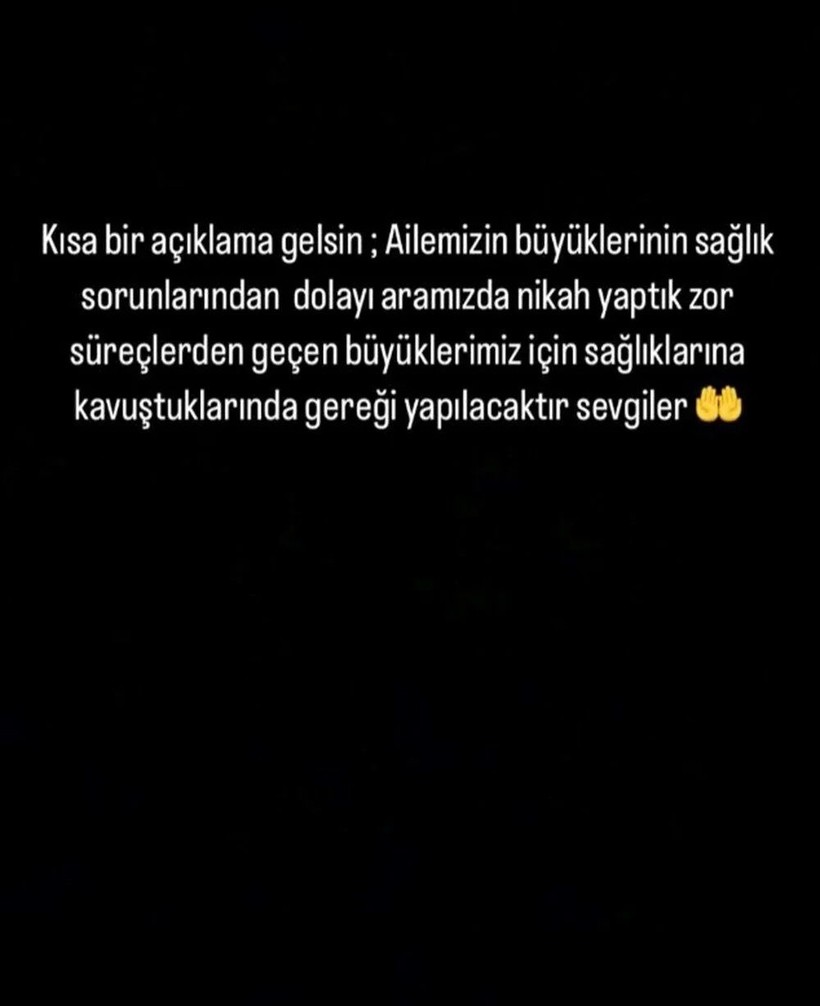 Asyalı, açıklamasında “Kısa bir açıklama gelsin: Ailemizin büyüklerinin sıhhat problemlerinden ötürü ortamızda nikah yaptık. Güç süreçlerden geçen büyüklerimiz için. Sıhhatlerine kavuştuklarında gereği yapılacaktır. Sevgiler” sözlerini kullandı.